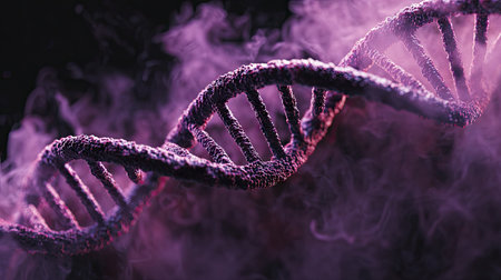 An artistic rendering showcases a glowing purple DNA strand against a dark backdrop. The image utilizes selective focus, creating a blurred effect in the background while highlighting the central subject. This illustrative piece could be suitable for educational, scientific, or conceptual projects, offering versatility in various media applications.