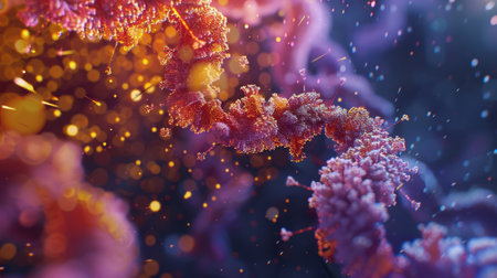 Colorful abstract representation of microscopic organisms, showcasing vibrant hues of pink, orange, and purple. intricate details create sense of depth and movement, evoking curiosity and wonder