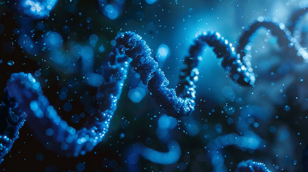 A magnificent view of a blue DNA molecule highlighted by soft lighting, emphasizing its complex structure and scientific significance.