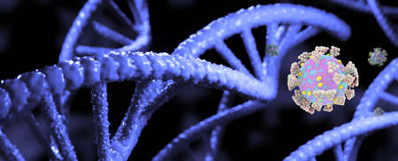 Glowing representation of a DNA strand with coronavirus cells in a high-tech medical research environment