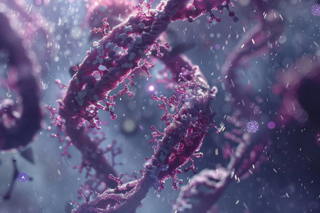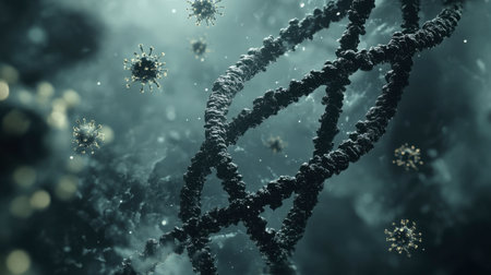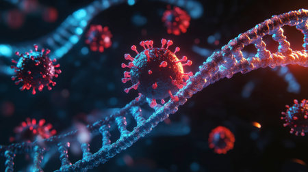 Detailed representation of a molecular RNA chain intertwined with various viruses showcases the complexity of interactions at a microscopic level.