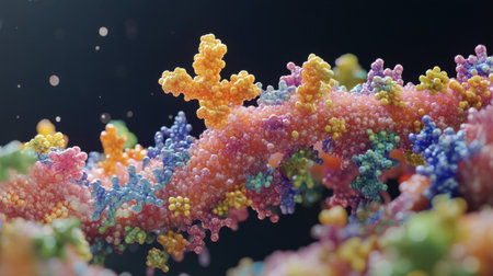 Vibrant and colorful structures resembling coral are displayed in a detailed macro view, highlighting their complexity and beauty against a dark backdrop.