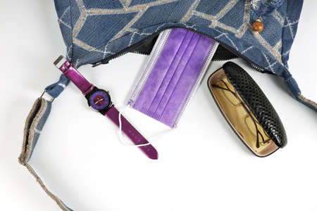 Female bag made of denim, outside which are clock, mask and glasses on white surface, in flat lay close-up