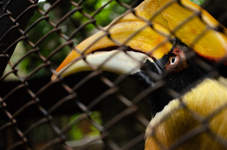 The close up headshot of a male great hornbill in a private zoo of Mae Hong Sorn, Thailand