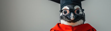 Penguin in graduation cap and glasses, red graduation gown, white background
