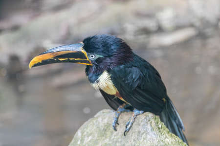 Aracari, a medium-sized tucan with bright plumage and enormous bill. Birds watching