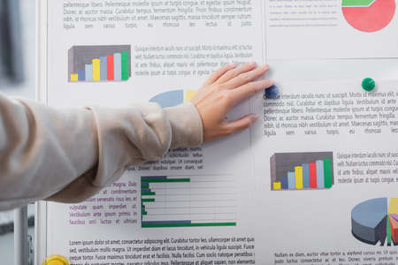 selective focus of papers with lettering near charts and graphs on notice board