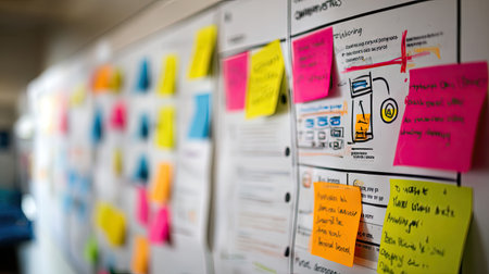 A vibrant display of sticky notes in a modern office, highlighting collaboration and planning efforts. This image captures the essence of teamwork and creativity in project management.