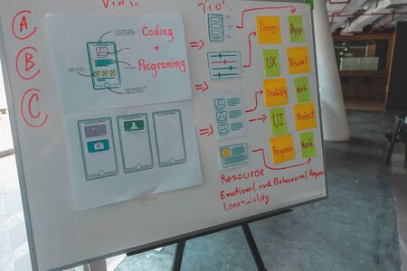 user experience UX designer designing web on smart phone layout. UI planning mobile application. developer work with business prototype