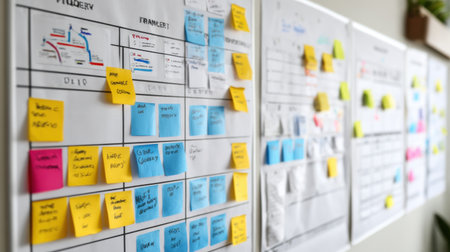 A detailed view of a project management board filled with colorful sticky notes showcasing planning, brainstorming, and collaboration among team members in a creative office environment.