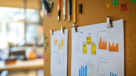 An engaging office scene features detailed data visualization charts pinned on a cork board, surrounded by colorful stationery, showcasing a vibrant work atmosphere for professionals.