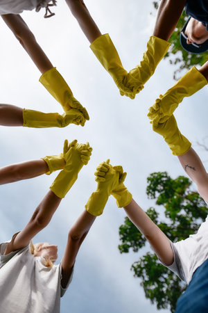 Great teamwork. Vertical shot of eco activists or volunteers wearing yellow protective rubber gloves holding hands together, bottom view