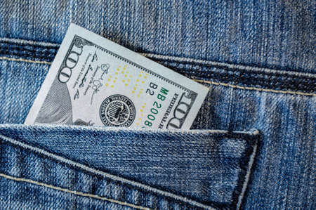 One hundred dollars in jeans pocket. Close up one hundred US Dollar as symbol of poverty and bankruptcy.