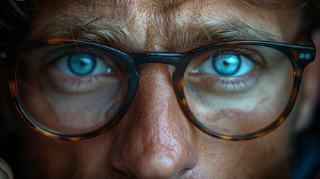 Detailed close-up of a man taking off his glasses, showcasing his intense blue eyes. The image captures focus and clarity, emphasizing eye color and vision.
