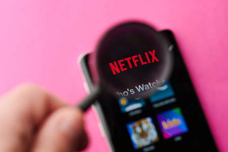 New-York , USA - June 4 , 2020: Using Netflix app on modern smartphone throw magnifier close up view