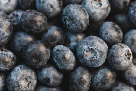 Pile of fresh ripe blueberries. Vegan and vegetarian and healthy dessert or snack concept. Background with macro texture of blueberry berries. Top view, selective focus, closeup