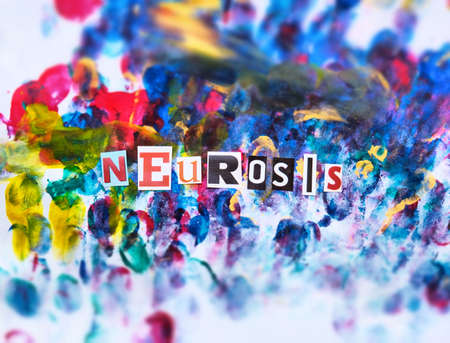 Word writing text Neurosis from cut letters on abstract strokes bright colorful background. Headline, card of psychology. Psychologic concept.