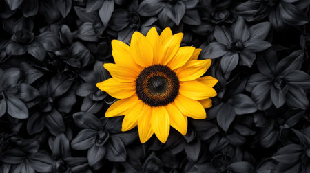 A bright yellow sunflower blooming in a garden of monochrome flowers, symbolizing vibrance in uniqueness