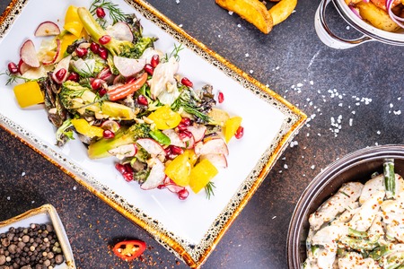 Healthy salad with spinach, arugula, red onion and pomegranate in plate on dark concrete background. Copy space