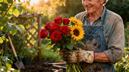 Proud elderly Caucasian man in a denim apron and soiled gardening gloves stands in his lush backyard, presenting freshly cut vibrant red roses and bright yellow daisies under warm, intense golden...