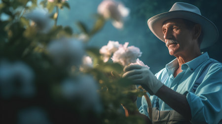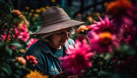 A senior man in hat taking care of his plants amidst lush greenery and vibrant blossoms, embodying an active senior lifestyle.
