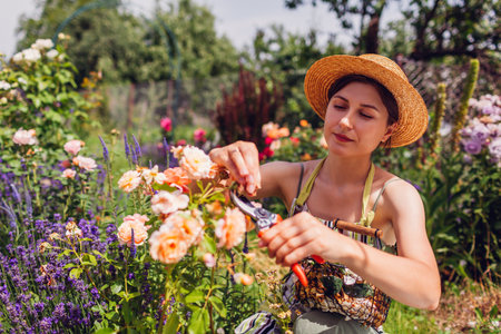 Young woman deadheading spent rose blooms in summer garden. Gardener cutting wilted flowers off with pruner and puts them in basket. English cottage garden
