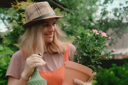Container gardening. Woman gardener watering potted roses using spray bottle.