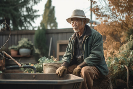 Male Asian senior gardening in backyard plants grass. Generative AI AIG23.