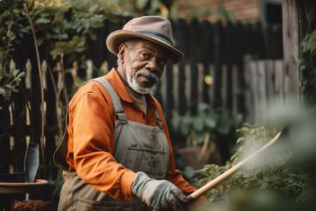 Male African senior gardening in backyard plants overalls. Generative AI AIG23.