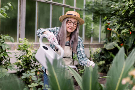 Portrait of beautiful senior gray haired woman in straw hat, checkered shirt and apron, watering plants with water can in her home garden or in a greenhouse, smiling and looking at the plants.