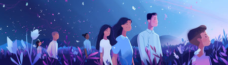 Silhouettes of a diverse group of people standing against a vibrant gradient background. Represents themes of inclusion and multiculturalism.