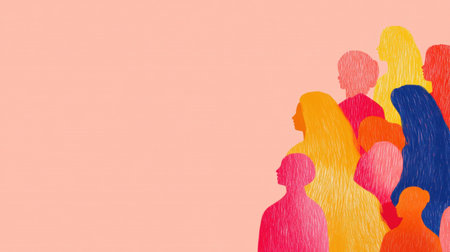 Vibrant silhouettes of diverse individuals against a soft pink background, showcasing unity and diversity with bright colors, perfect for social issues and community concepts