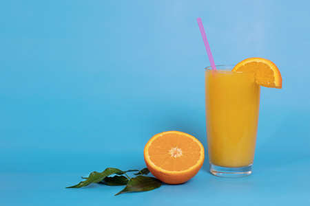 Orange juice in a glass with a straw, decorated with a slice of orange, half an orange with leaves on a blue background. Summer drink. Copy space