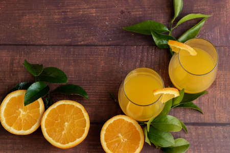 Freshly squeezed orange juice on wooden background