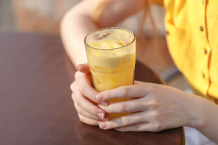 One glass with yellow colorful mango fresh juice stay on yellow table. Minimalistic trendy background with copy space.