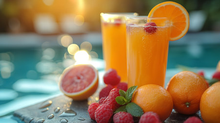 glasses of juice and fresh fruits near swimming pool.