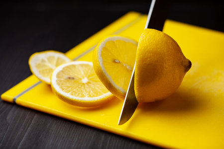 Cutting lemon in pieces, yellow cutting board on dark background