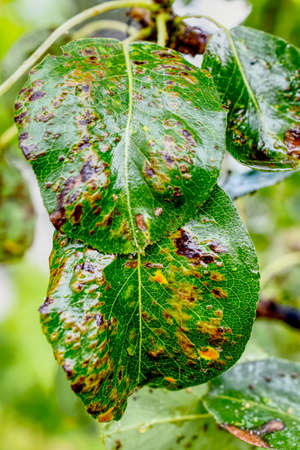 Fungal spots on leaves. Common Plant Diseases. Black spot or blotches on garden plant. Blight infected stems. Canker wounds by bacterial pathogens. Man holding foliage with brown areas and yellow halo