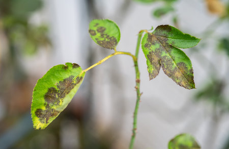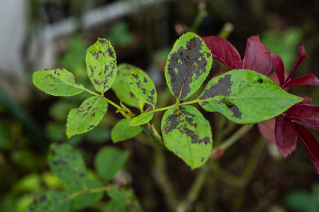 A rose leaf with black spot disease, Diplocarpon rosa