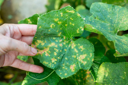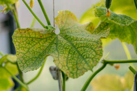 Green cucumber leaves with yellow spots of the mosaic virus. Inspection of the diseased plant.