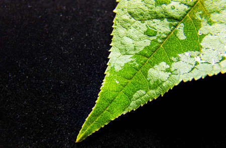 green leaf on black background. water flows down from a green leaf