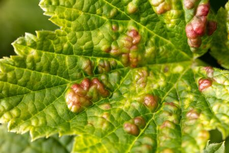 Close-up of a red wound on a green leaf from a biting aphid on nature. Macro