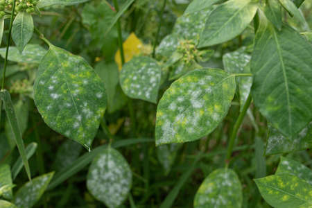 White fungus on leaves,Infected plant displays white powdery spots on the leaf. Close up.