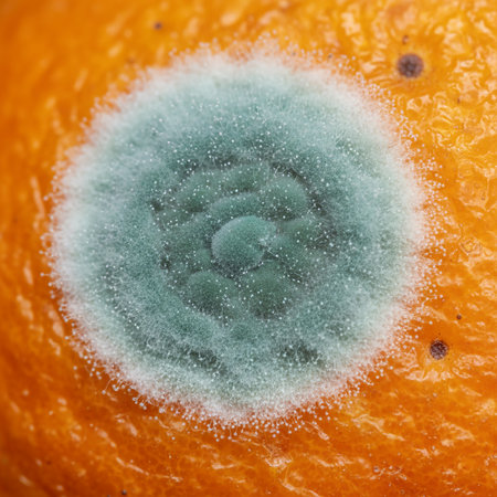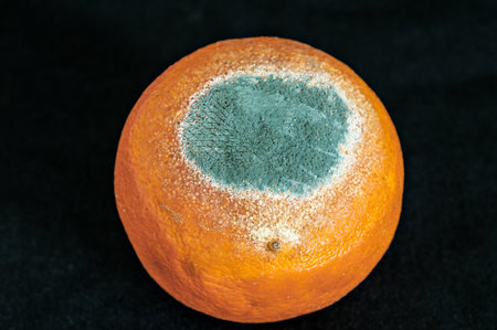 spread of green fungal mold on spoiled food products, macro view through a microscope