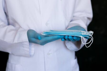 close up of doctor's hand with a medical face mask for protection against infection. Medical mask for protection against flu and other diseases and prevention of the spread of virus and epidemic.