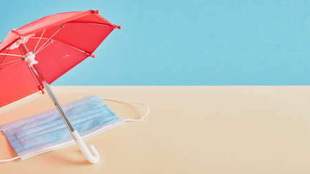 face mask under a red umbrella on a blue and beige background, beach vacation and tourism during the epidemic concept