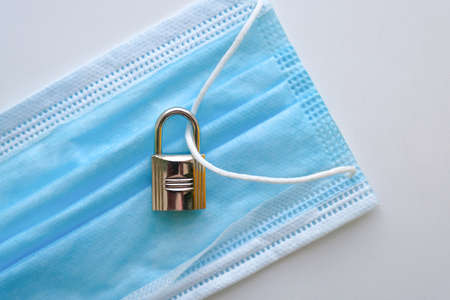 Padlock on a surgical mask representing a lockdown due to coronavirus crisis