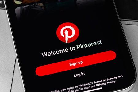 Pinterest. Smartphone in male hand on Pinterest smartphone screen on blue, yellow, black background. July 2020. Kiev, Ukraine.