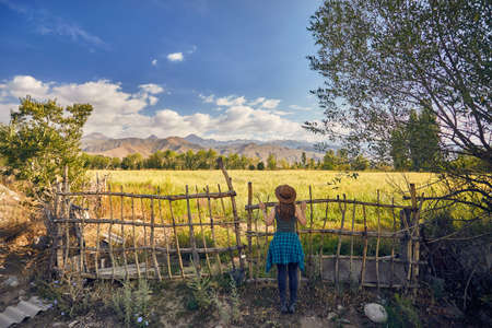 Woman in hat and green checked shirt near the fence gate looking at field in the farm at the morning
