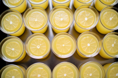 shot of lemonade-filled shot glasses arranged in a circular pattern, created with generative ai